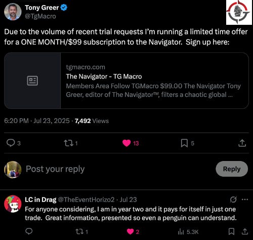 When markets move fast or volatility spikes, I drop an urgent Navigator Bulletin—an instant read on a major move, dislocation, or setup that can’t wait till the next issue.